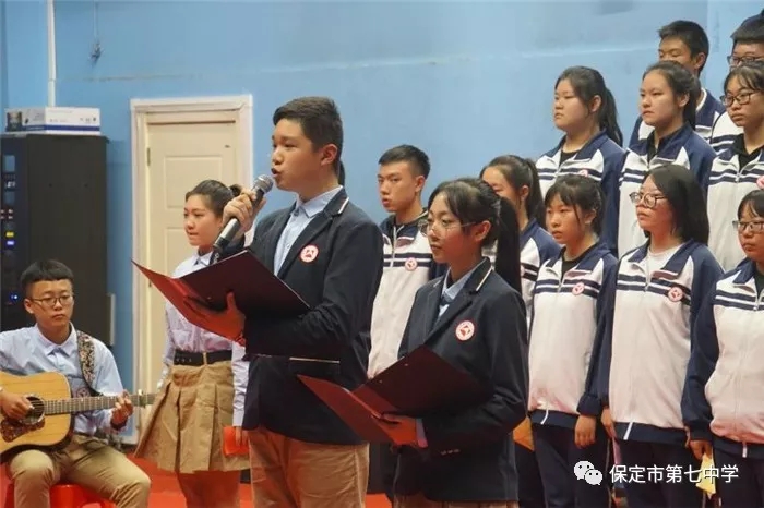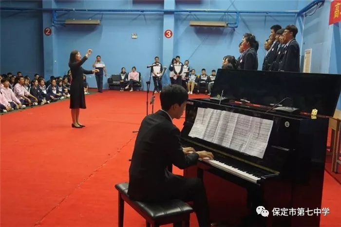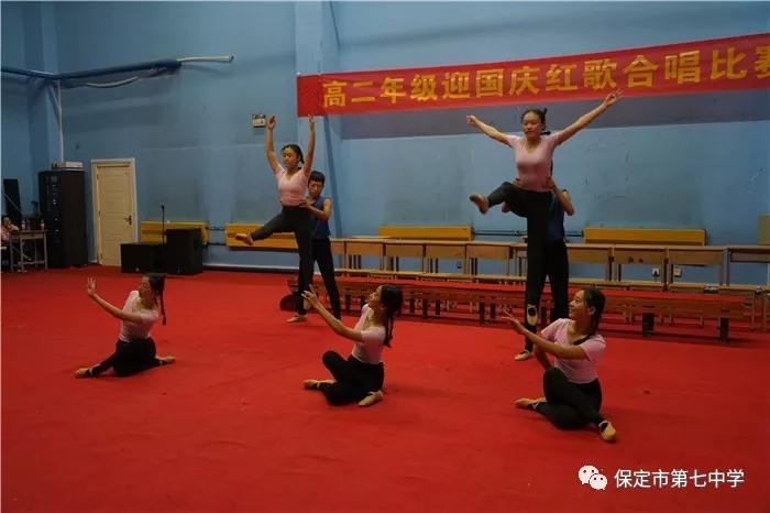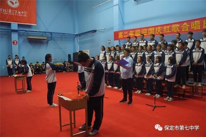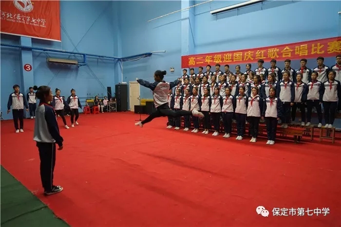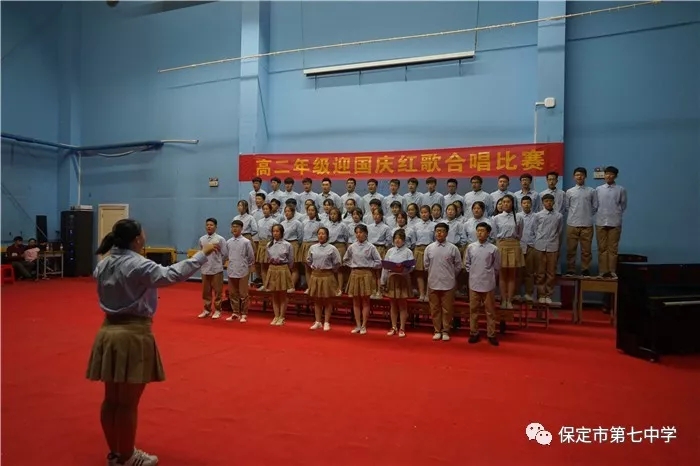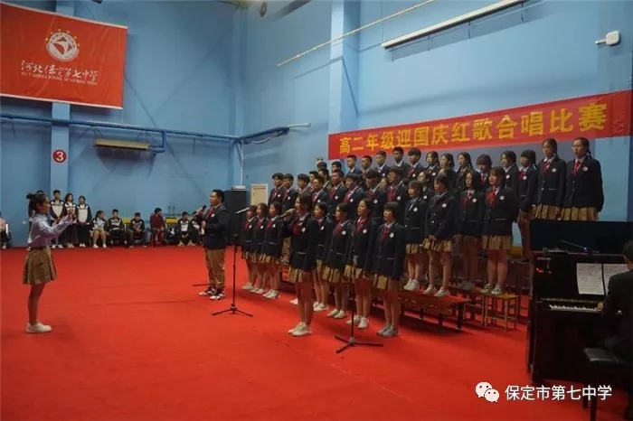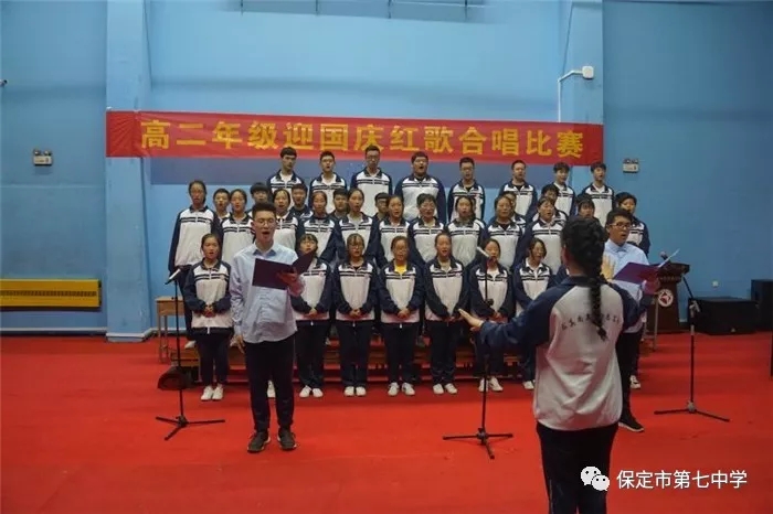 为了庆祝我们伟大的祖国建国69周年;丰富学生课余生活,努力营造和谐向上、健康文明的校园文化氛围,促进学生德智体美的全面发展,高二年级部于9月28日下午在保定七中体育馆举行了“迎国庆 红歌合唱”比赛活动。保定七中薛春燕副校长,校长助理刘金花主任,教育处刘金来主任,办公室崔东海主任,高二年级李立灵主任,及级部三位副主任封立江、袁野、田晓慧出席了此次活动。袁野主持此次比赛。