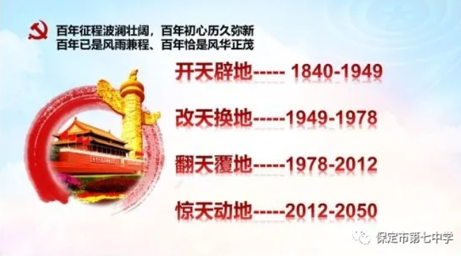 古人云:以铜为镜可以正衣冠,以人为镜可以明得失,以史为镜可以知兴替。我们回顾历史,既是尊重历史,更是启迪智慧。中国共产党100年的奋斗历史充满着智慧的光芒。红船精神,井冈山精神、长征精神、延安精神、西柏坡精神、深圳精神、航天精神等等都是我们青春成长路上最丰厚的养料,是新一代每个党员的圣贤经典、精神食粮。我们有理由重温、歌颂、赞美党史,如果你正渴求成功,那么,你该学学党史,中国共产党的历史就是最大的成功学。如果你希望平平淡淡,那么,你该学学党史,中国共产党的百年奋斗给了中国人充分选择的权利。如果你年龄略长,那么,你该学学党史,因为中国共产党百年波澜壮阔中就有你拼搏的足迹。如果你还正年轻,那么,你该学学党史,因为,你的视野和胸怀将决定下一个百年中国往何处去。下面,我们大家一起学党史吧。中国共产党的百年征程可以用四个“地”形容:开天辟地、改天换地、翻天覆地、惊天动地。