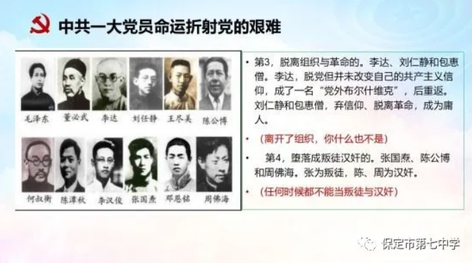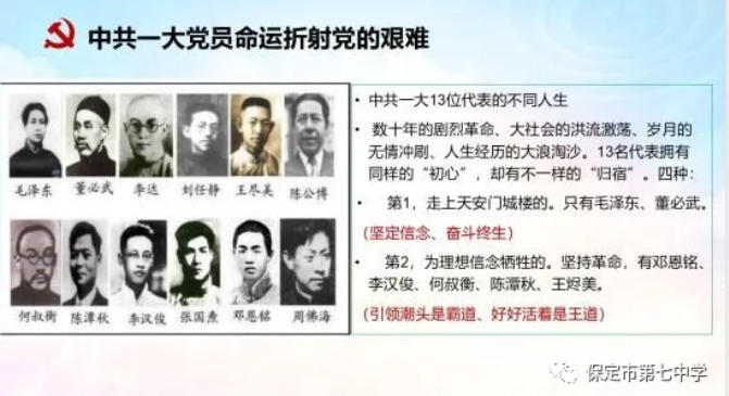 今天,让我们聚焦中共一大现场,感悟始生之难。《易经》说:始生之难。如果你了解这些历史,就会知道党的诞生之初是多么的艰难。在伟大的奋斗之初,有人出身名门,有人智力超群,有的是名校高材生,有的资历老,背景深,但他们终究只是过客,在血与火的淬炼中鲜有成功者。最典型的代表是张国焘。北大高材生,学生运动领袖,中共一大执行主席,红四方面军的主要领导人,但是后来野心膨胀,1936年另立中央,1938年叛党投入到戴笠门下,出演了一部中共创始人反中共的闹剧。目睹这样的开头,很难相信中共会走出如今这样宽广的大道。但只要信仰之星火不灭,终能成燎原之势。在全国的58位代表中,只有四位走到了最后。一大的13位代表,7人出了问题,4人牺牲,只有毛泽东,董必武走到最后。这与其说是毛、董的胜利,不如说是共产主义信念和卓越斗争精神的胜利。诗云:糜不有初,鲜克有终。多少人在用自己的经历反复证明这句话的正确性呢?学党史,常警醒。党史渗透着教育人的奉献。