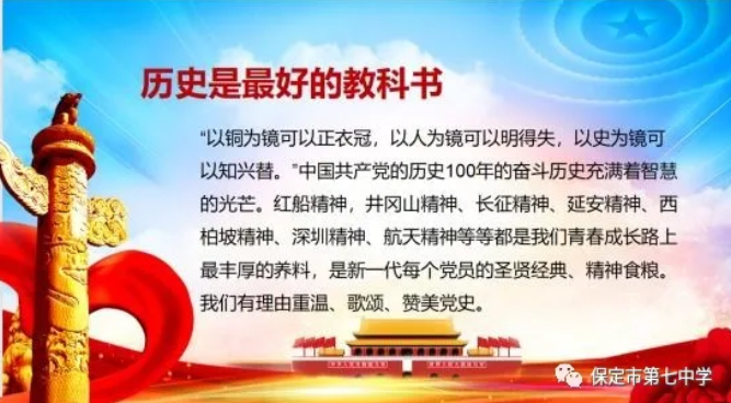 为庆祝建党一百周年,激励教师继承和发扬中国共产党的优良传统,保定七中高一年级陆续开展党史学习教育系列活动。4月27日,高一年级刘会芬老师作为本次活动的主发言人,带领高一全体教师重温党史,回顾中国共产党100年的峥嵘岁月。